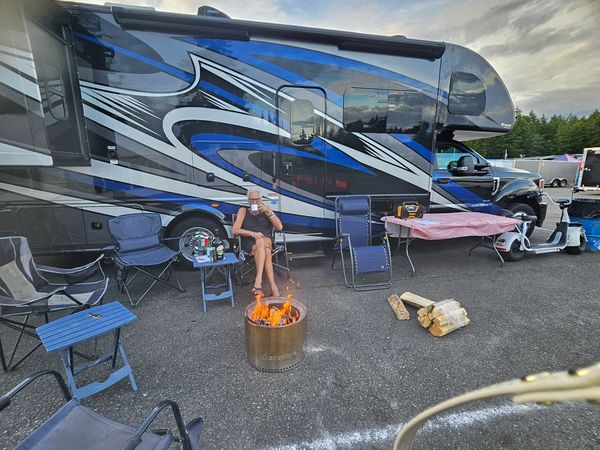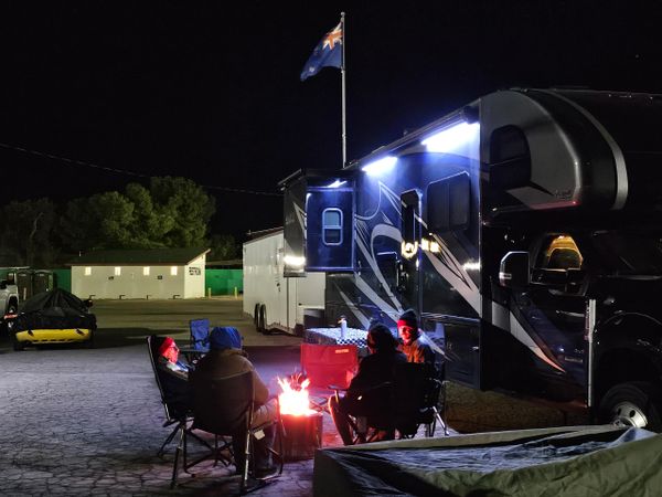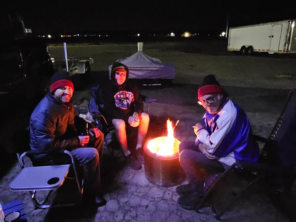 Trying to shelter from the wind. Fire pit keeping us warm!