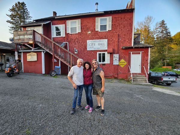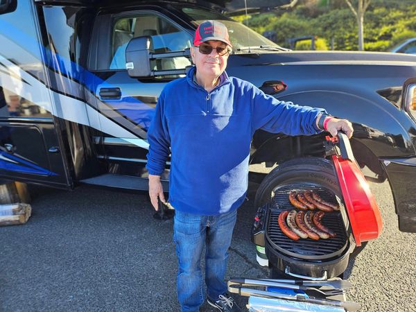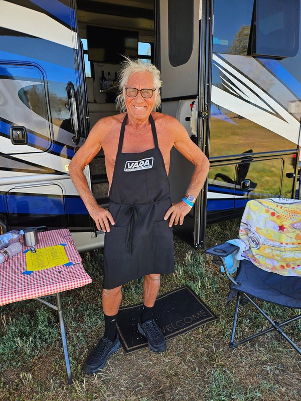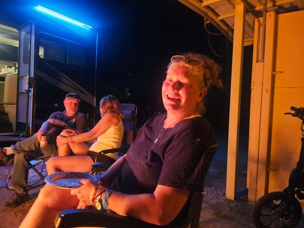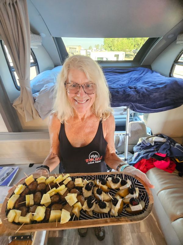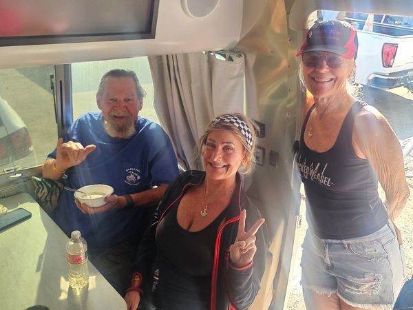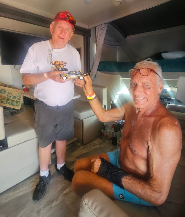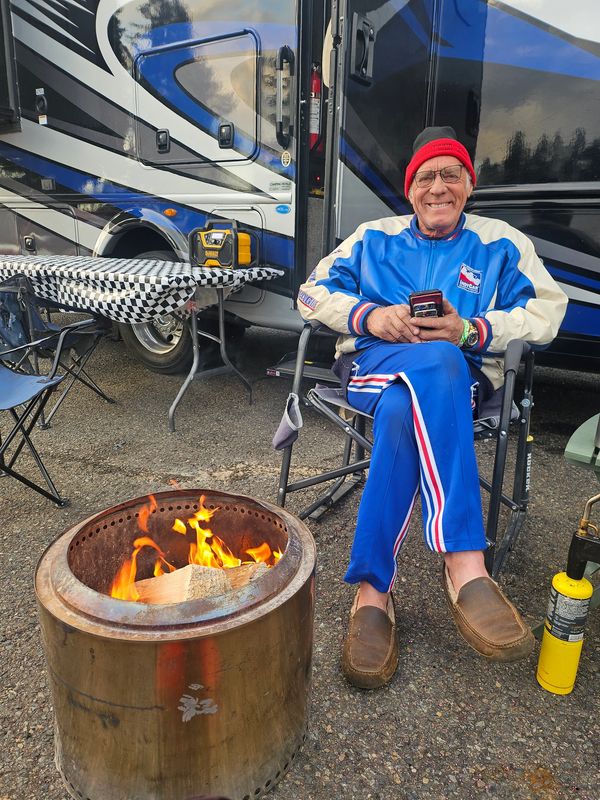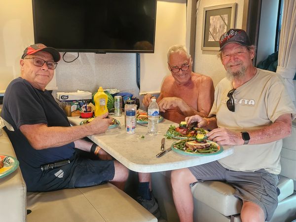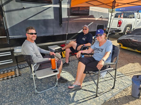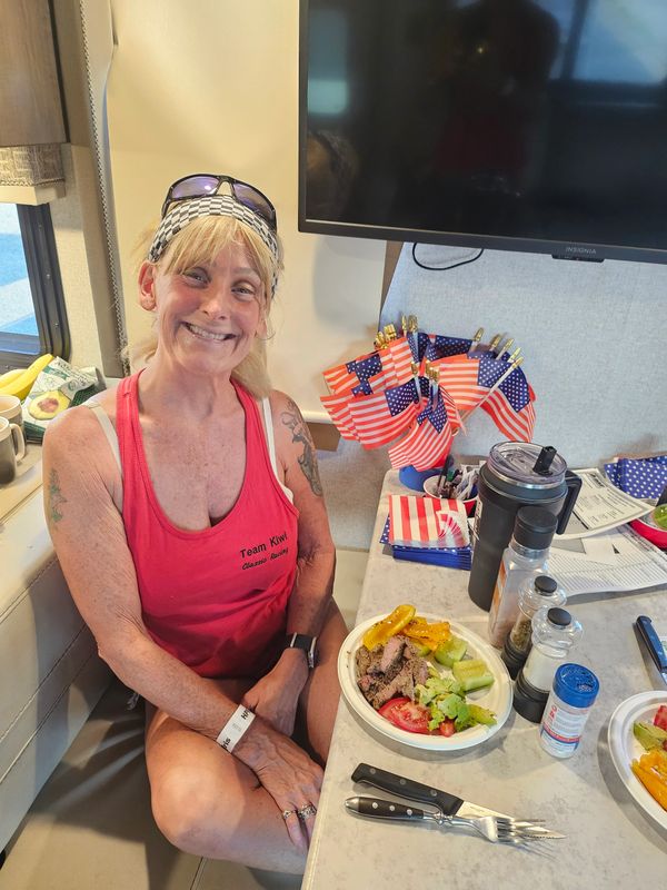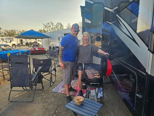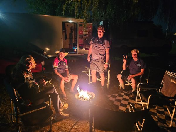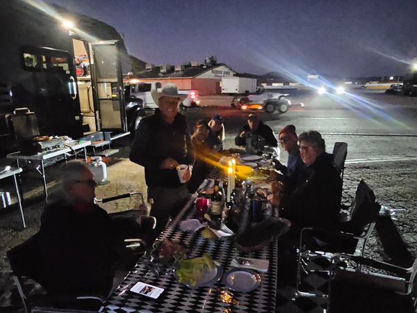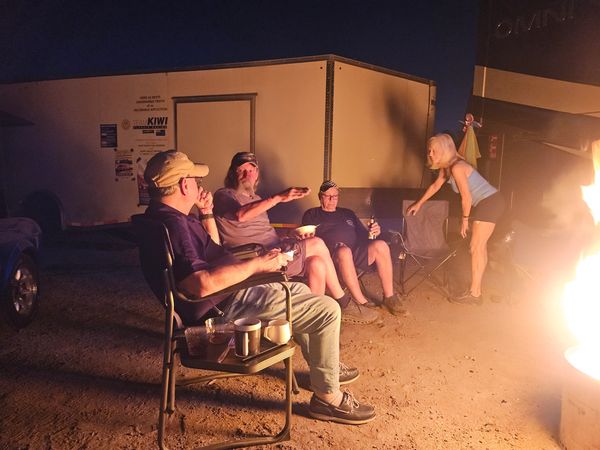 Thursday night dinner at Team Kiwi's pit. Hawaiian ham steak stack with grilled pineapple! Mark, Denie and Mike in the camper