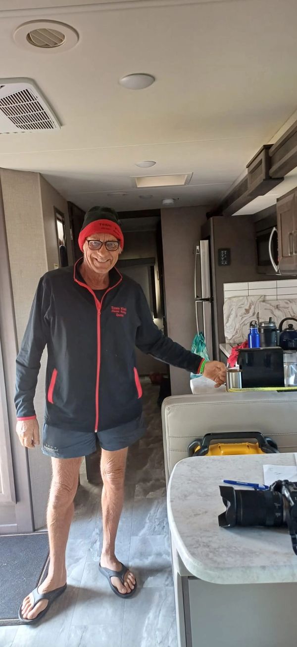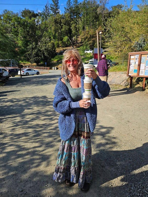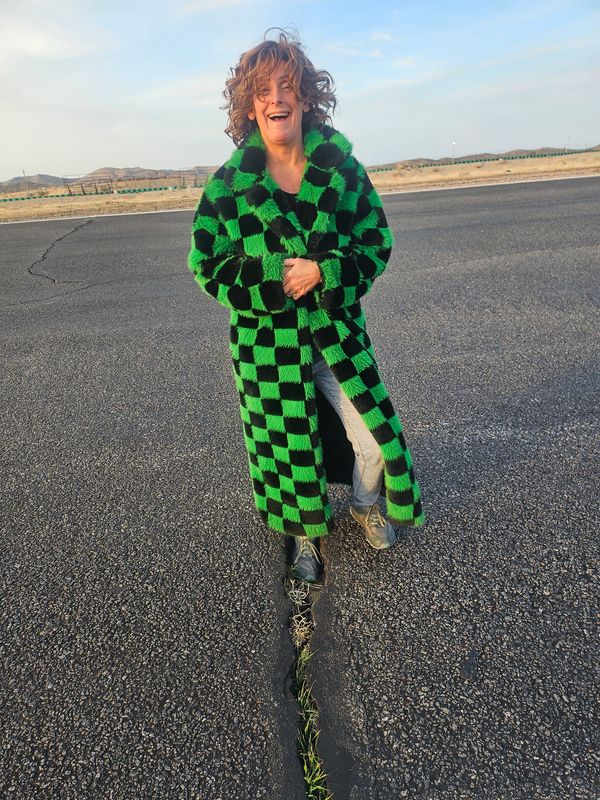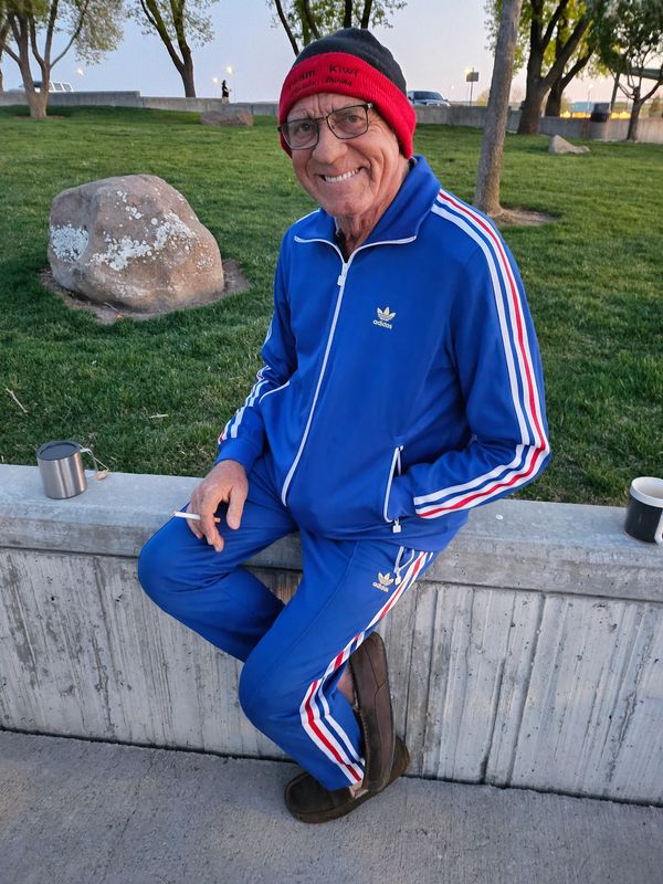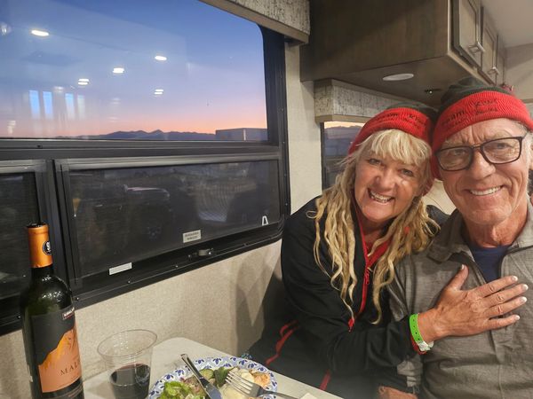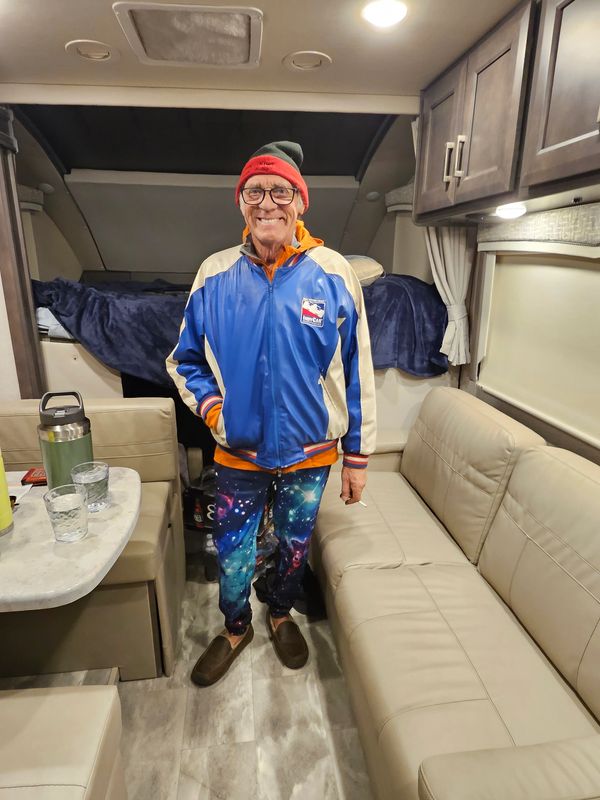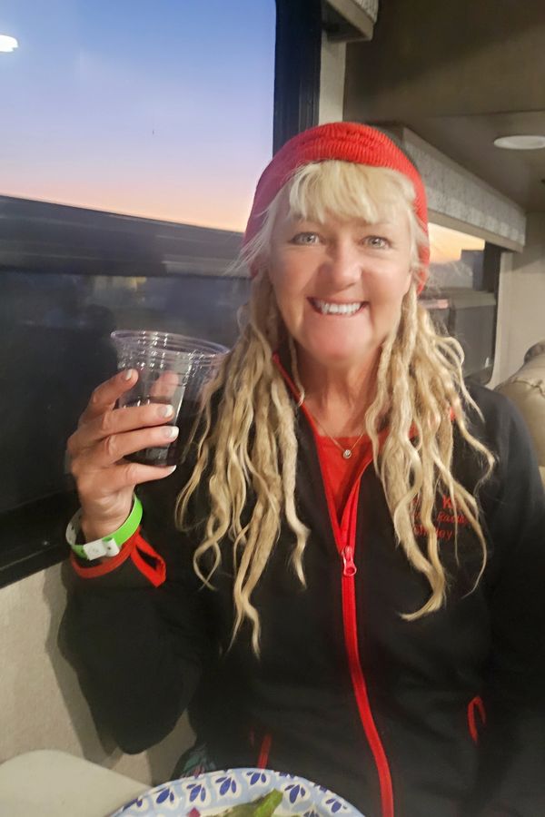 Denie looking colorful and keeping warm - windy night at Spring Mountain!