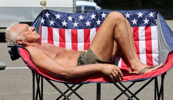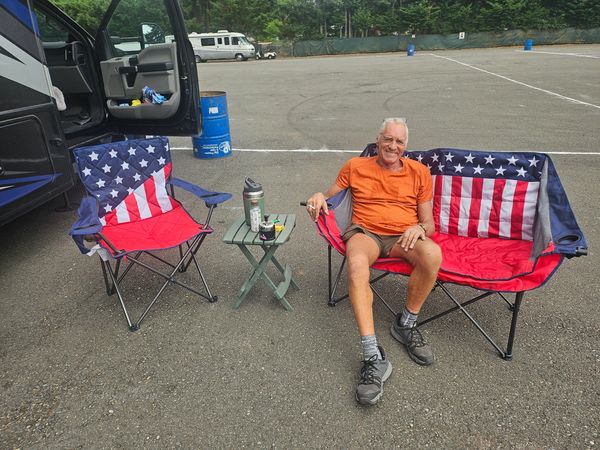 Denie checking out our newly acquired 4th of July appropriate chairs