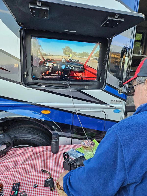 Watching the go-pro footage on our outdoor TV after the race on Saturday