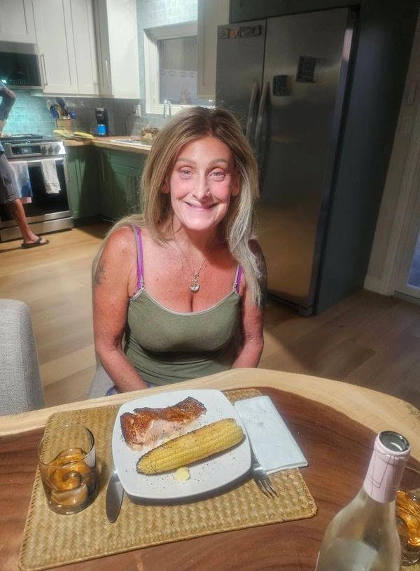 Denie happy to get some doggy love from Mazey (Shirley and Don Racine's doggy)